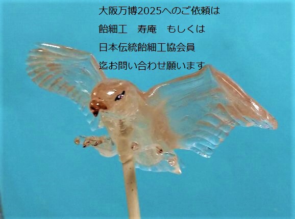 世界の方々に江戸時代より 受け継がれた飴細工を目の前で 作られていく様子を ご覧頂ける機会に! [image: タカ4月.JPG] 大阪万博2025へのご依頼は 飴細工 寿庵 <juan3amezaiku2017.wixsite.com/juan> もしくは 日本伝統飴細工協会員 迄お問い合わせ願います