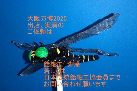 大阪万博2025へのご依頼は 飴細工 寿庵 <juan3amezaiku2017.wixsite.com/juan> もしくは 日本伝統飴細工協会員 迄お問い合わせ願います [image: とんぼ.JPG]